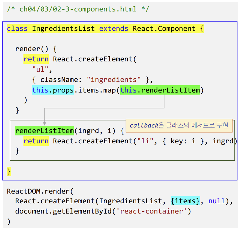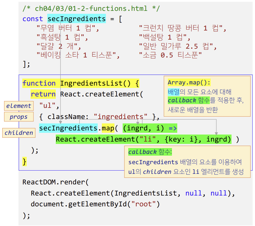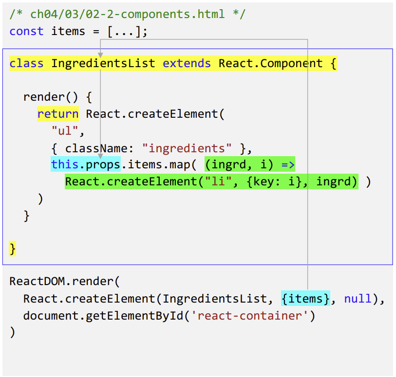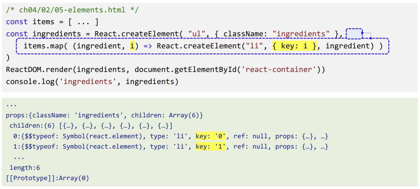 items.map( (ingredient, i) => React.createElement("li, {key:i}, ingredient)))