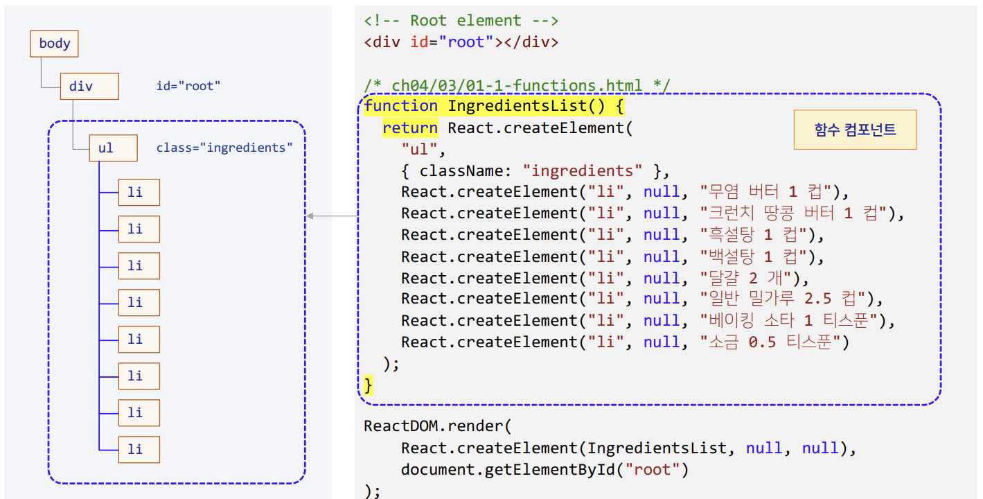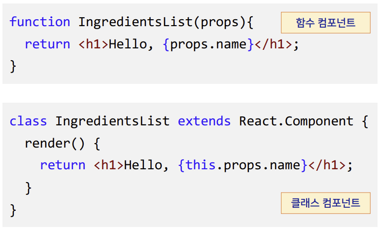 → 리액트 엘리먼트 여러 개를 하나의 트리구조로 묶어, 재사용할 수 있도록 만들어놓은 함수/클래스 - 함수와 클래스의 기능적 차이는 없다. (함수를 훨씬 많이 사용하기 때문에, 클래스는 참고삼아 알고있으면 된다.)