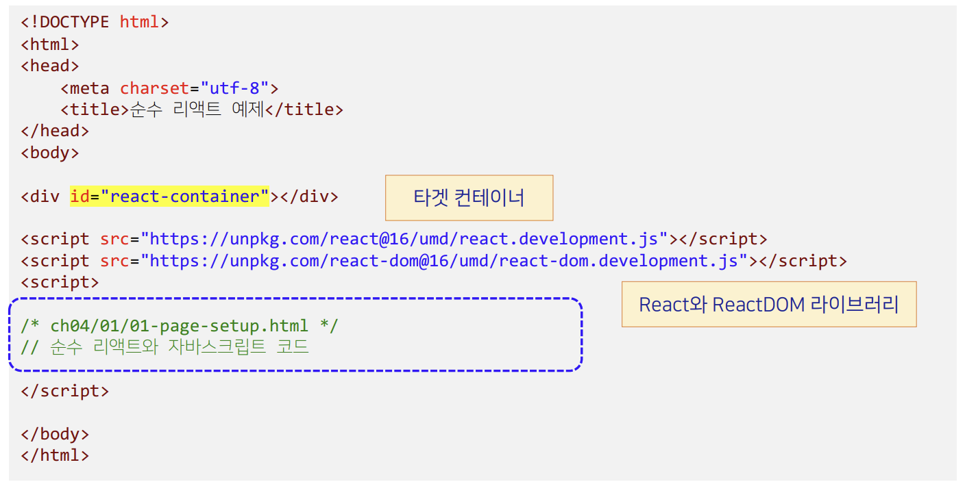 아래 설정은 브라우저에서 리액트를 사용하기 위한 최소한의 요구 사항이다.