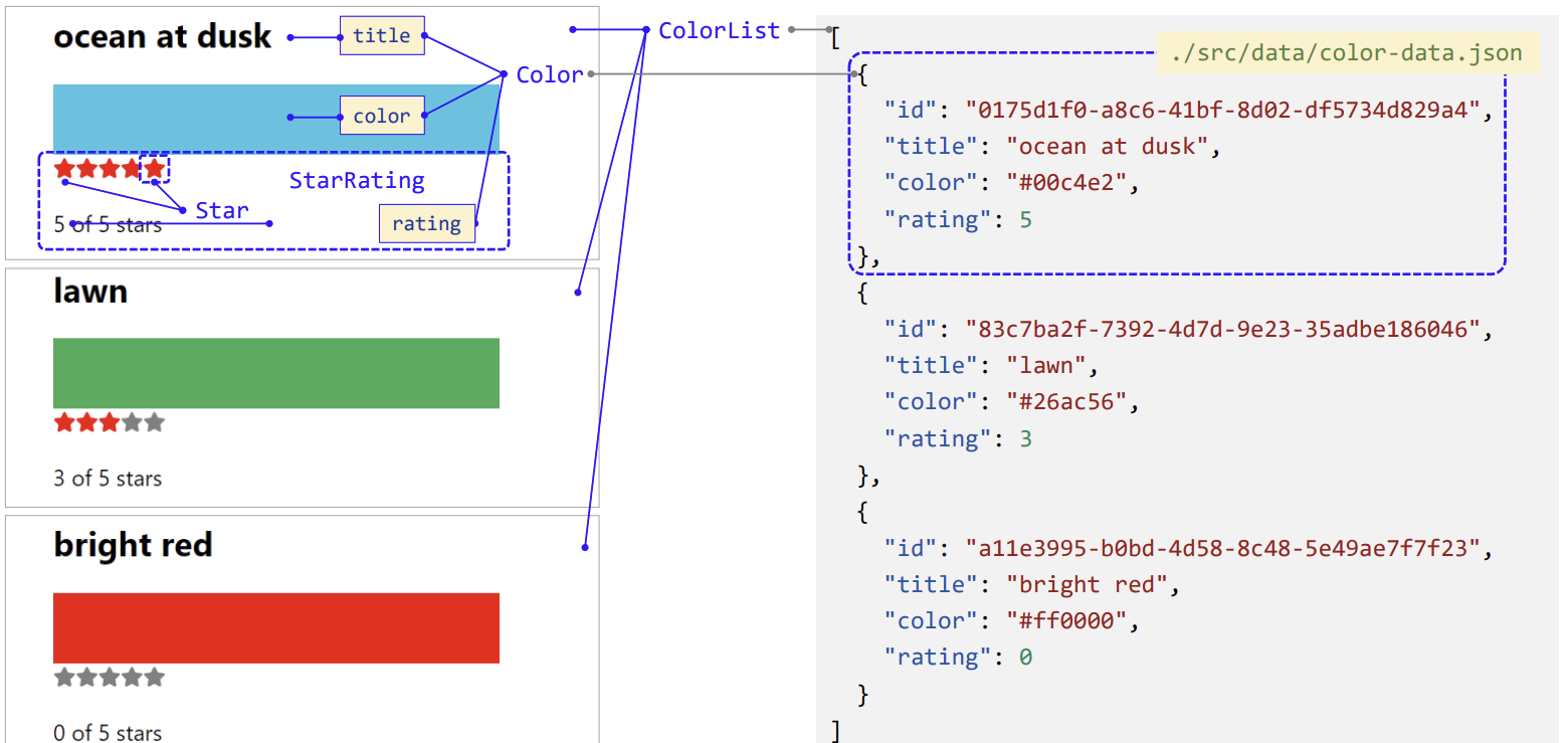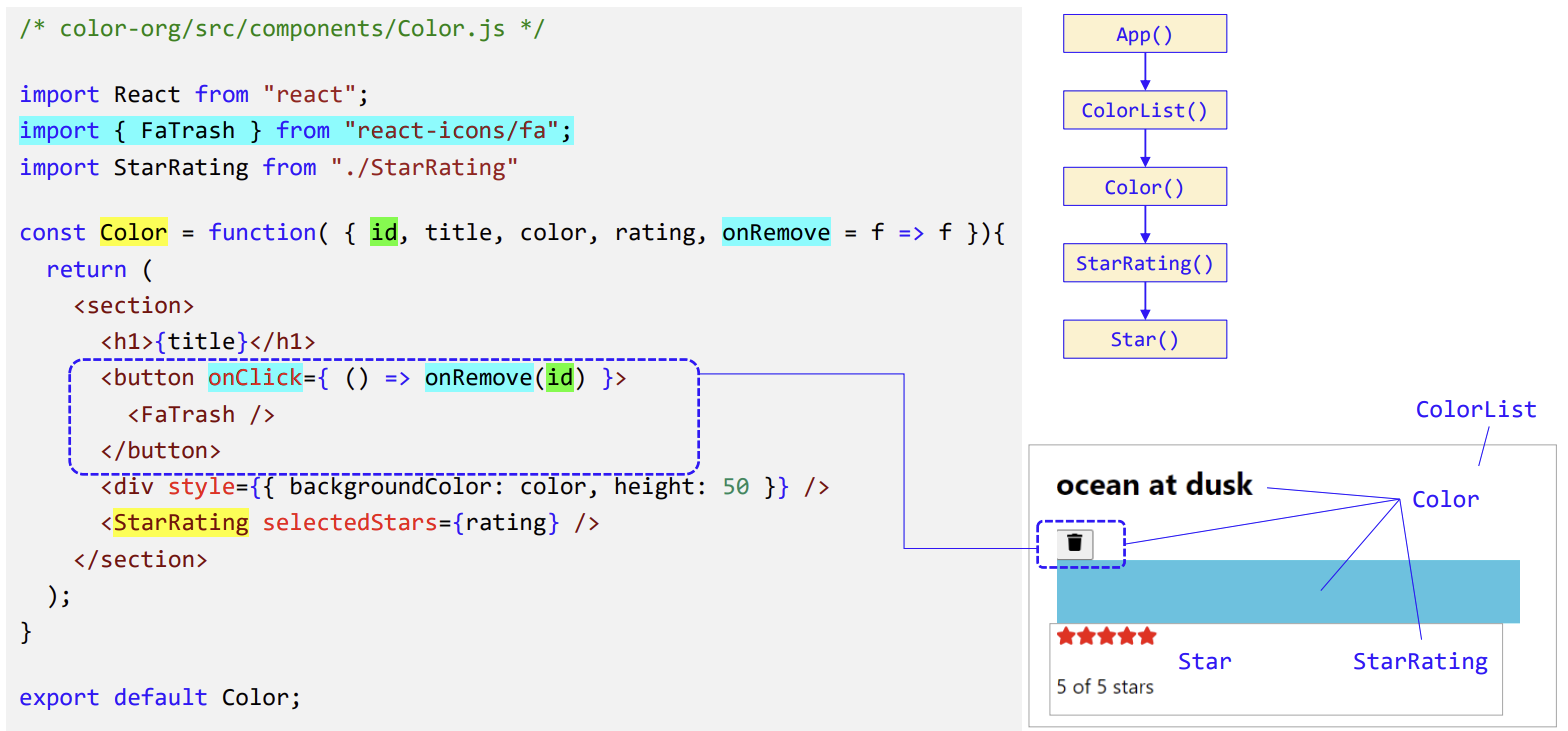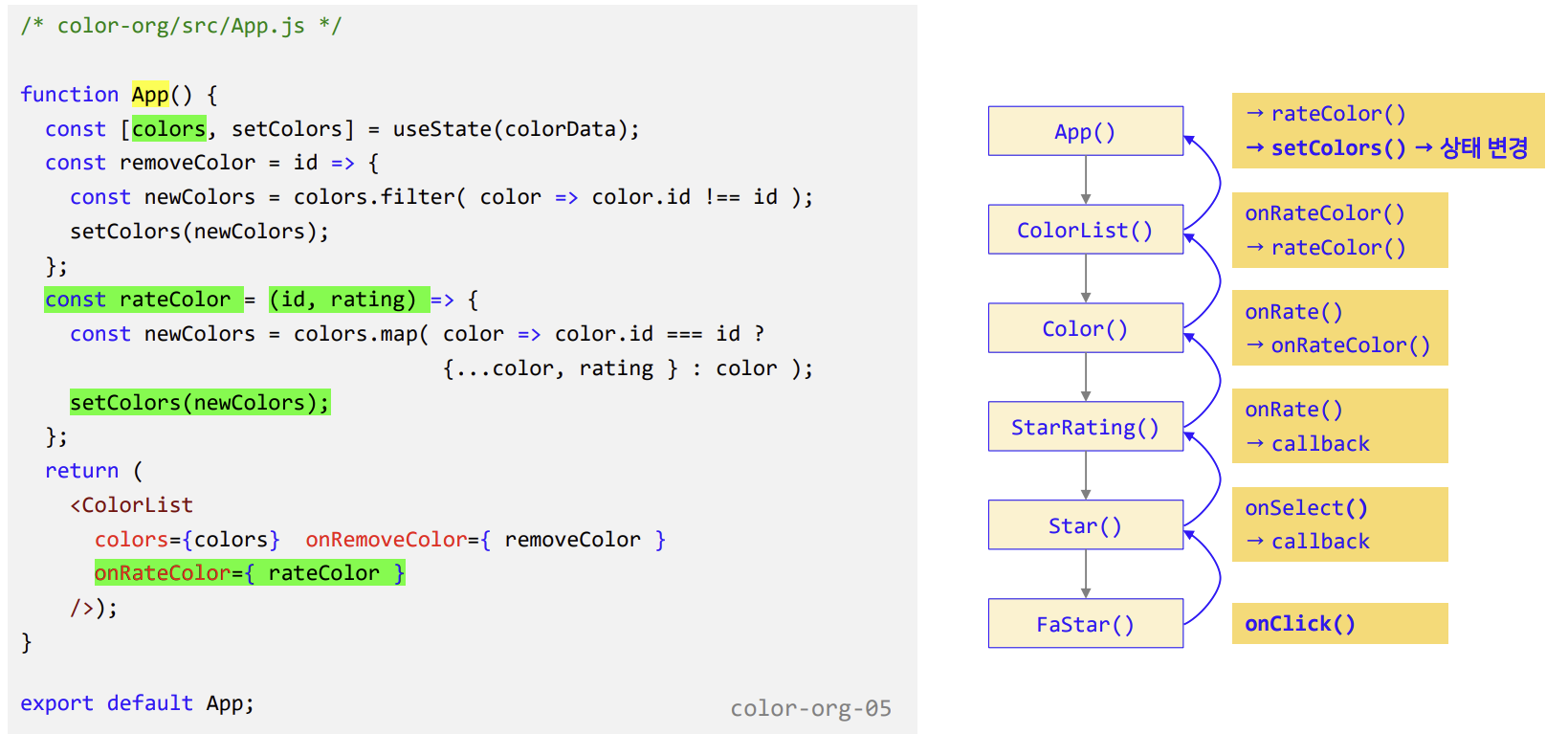 (1) 상태를 컴포넌트 트리의 아래로 내려보기 : App, ColorList, Color, StarRating, Star 컴포넌트
