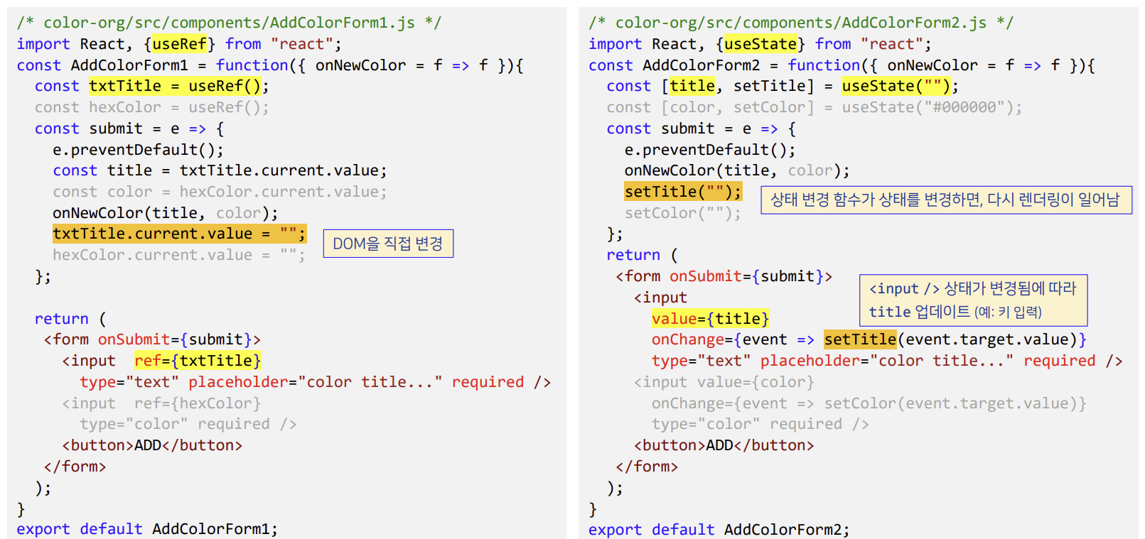 - color와 text 둘다 값을 초기화하면서, 자기 컴포넌트도 아닌데 값을 변경하게 된다. (별로 바람직 하지 x → useState 사용)